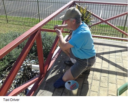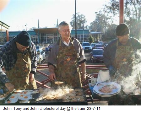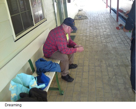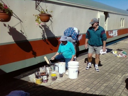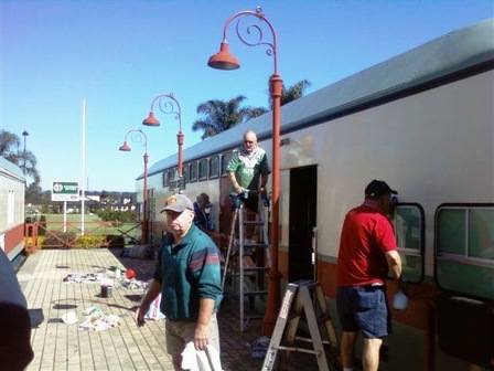 Just a brief update: The Train Washers are proceeding with the usual level of enthusiasm for the job (see the photos 'trio' and 'dreaming' – three painters to a pole). The painting is still progressing with some rails and other smaller items all that's left for a coat. Congratulations to Reno, Mick, John, Paul, Ron, Ken, Dave and all others who have lent a hand or some verbal advice and encouragement – it's all been duly noted. The July Breakfast was another success, with guest speakers and birthday celebrations (well done JB).